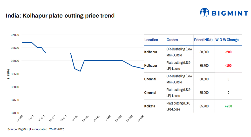 In Chennai, foundry scrap prices remained unchanged during the week, reflecting balanced demand-supply dynamics. CR-busheling (low Mn, bundled) was assessed at INR 38,500/t, while plate cutting scrap (LS & LP, loose) stood at INR 35,000/t.
