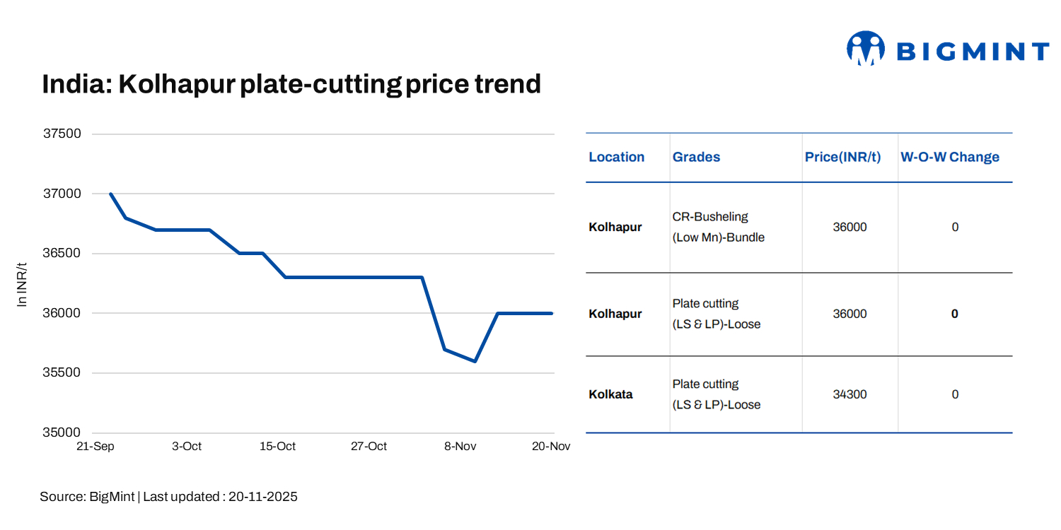Plate cutting scrap traded at INR 34,000-34,500/t DAP Kolkata, reflecting steady conditions with marginal improvement in supply.