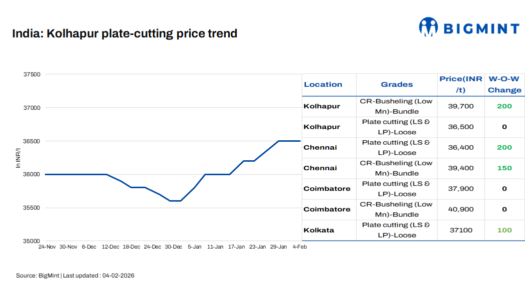 In Kolhapur, plate-cutting scrap prices held steady at INR 36,500/tonne (t), reflecting balanced supply-demand conditions. However, CR-busheling (low Mn, bundled) prices rose by INR 200/t w-o-w to INR 39,700/t. Market participants pointed out that consistent dispatches to auto-component and tractor foundries prevented any downside, even as buyers refrained from aggressive stocking. The plate-cutting price curve through late January into early February indicates a gradual recovery after December softness, reinforcing a stabilising market tone.