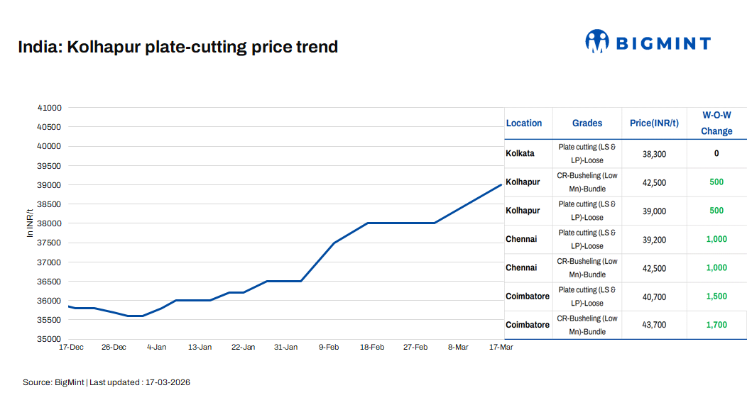 Prices witnessed the sharpest rise, with foundry plate scrap up by INR 1,500/t to INR 40,700/t and CR-busheling increasing by INR 1,700/t to INR 43,700/t. The surge is driven by acute material shortages, strong local demand, and limited recycler output amid gas constraints.