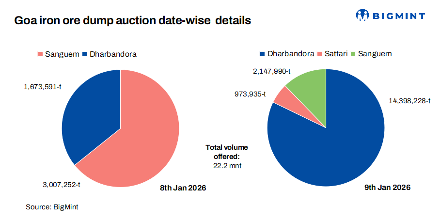 - 8 Jan’26: Around 4,680,843 t of iron ore dumps (Fe 45.8-47.8%) from Santona, Dharbandora, and Sanguem talukas.