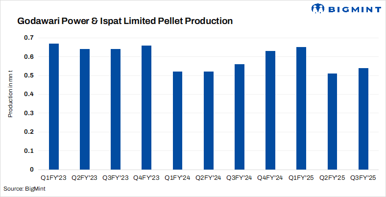 Godawari Power and Ispat Limited (GPIL), a leading steelmaker in central India, witnessed a 20% increase in pellet production to 610,800 tonnes (t) in Q3FY’25 against 508,200 t in Q2FY’25. This was declared in the company’s Q3FY’25 results recently. Conversely, the company’s pellet production stood at 1.77 million tonnes (mnt) in 9MFY’25, marginally down by 2% y-o-y, while sales fell 8% to 1 mnt in 9MFY’25 compared to 1.09 mnt in the year-ago period.