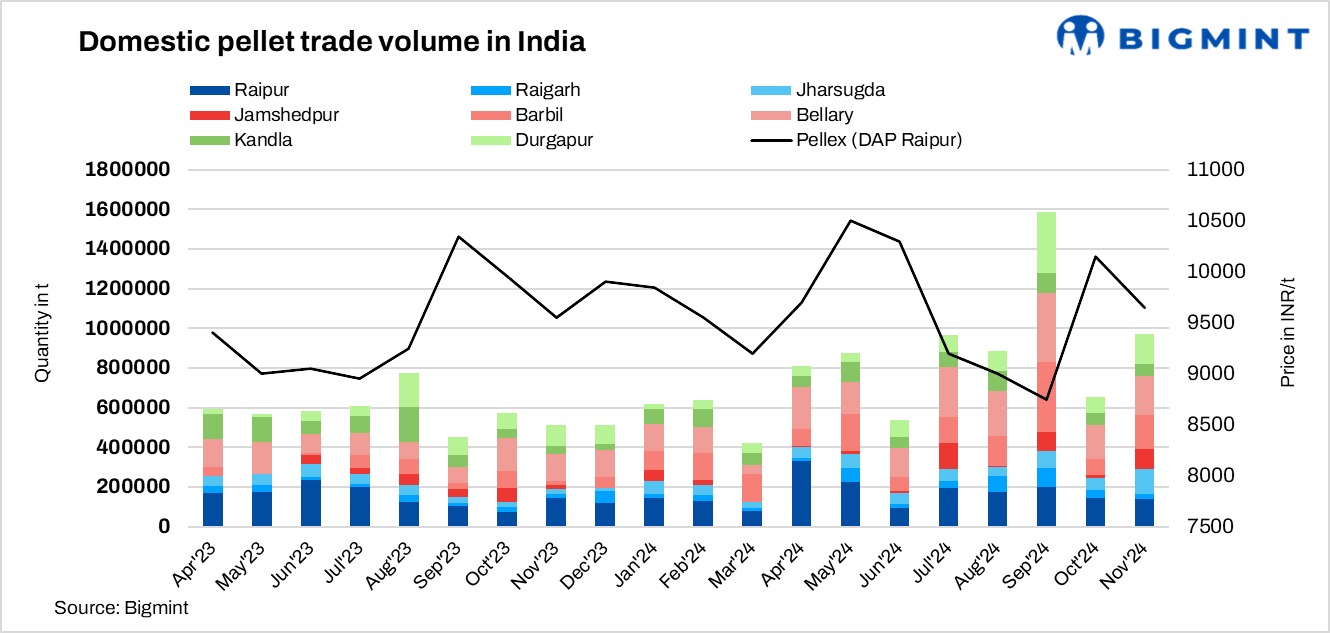 Gujarat-based steel mills booked around 50,000 t of raw pellets (Fe63%, 6.5-8% Al2O3+SiO2) at INR 9,700-9,800/t ($114-115/t) FOB last week from a southern India-based producer, sources informed BigMint. Some eastern coast-based sellers offered pellets in Gujarat at INR 10,300/t ($121/t) DAP recently. Notably, due to lower export realisations, major pellet suppliers are diverting material to the domestic market, which is seeing decent trades.