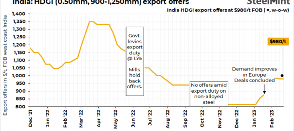 Export offers of hot-dipped galvanised iron (HDGI) coils (0.50mm, 900-1,250mm) from India remained unchanged w-o-w to $980/t FOB west coast this week. Mills are of the opinion that deals shall be signed for April shipments in the near future amid an improving buying interest in Europe, sources informed SteelMint. India’s galvanised steel exports in Jan’23 increased m-o-m to 0.22 mnt against 0.07 mnt in Dec’22.