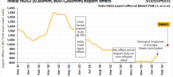 Export offers of hot-dipped galvanised iron (HDGI) coils (0.50mm, 900-1,250mm) from India fell by $5/t w-o-w to $980/t FOB west coast this week. Demand is there in the market but buyers are holding back from booking amid volatility in the global market, sources informed SteelMint. India’s galvanised steel exports in Jan’23 increased m-o-m to 0.22 mnt against 0.07 mnt in Dec’22.