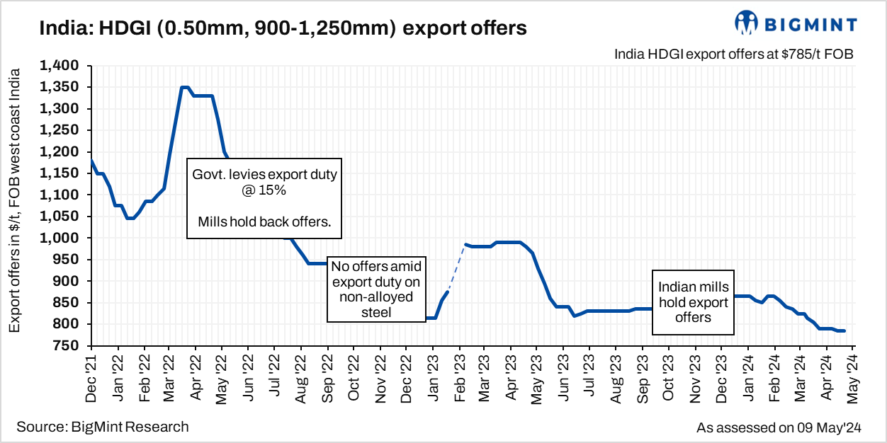Export offers of hot-dipped galvanised iron (HDGI) coils (0.50mm, 900-1,250mm) from India remained stable this week at $785/t FOB west coast. Faced with a quiet European market due to limited demand, Indian mills are maintaining stable prices for HDGI. However, buyers in Europe are also hesitant to purchase Indian material due longer lead times and risks related to safeguard measures.