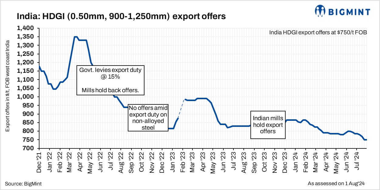 Export offers of hot-dipped galvanised iron (HDGI) coils (0.50 mm, 900-1,250 mm) remained stable w-o-w at $750/t FOB west coast, India. An Indian steel major has concluded a deal of around 5,000 t of HDGI at $750-800/t CFR Europe for late-Aug’24 delivery, informed a reliable source. Mills have kept offers stable amid recent deals and limited demand in the European market.