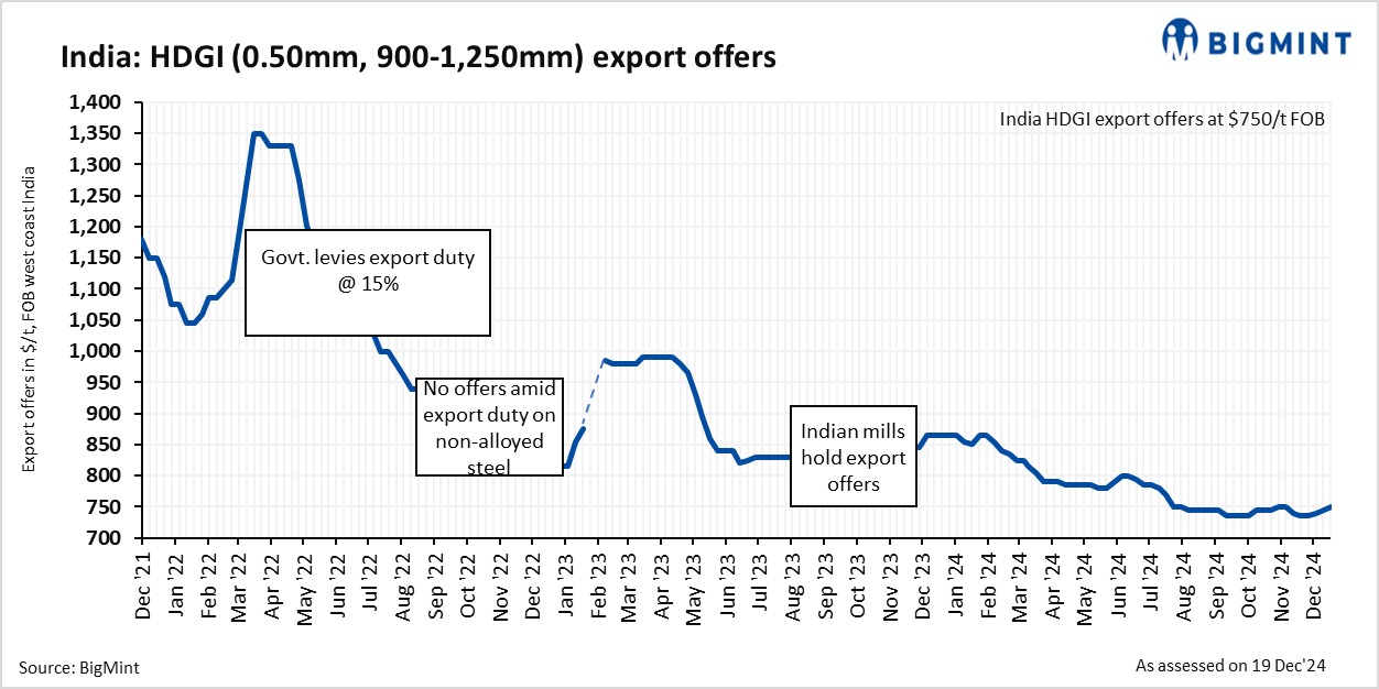 Export offers of hot-dipped galvanised iron (HDGI) coils (0.50 mm, 900-1,250 mm) rose by around $5/t w-o-w to $750/t FOB west coast, India from $745/t FOB a week ago. Deals of around 6,000 t of HDGI were concluded by Indian mills at $800-810/t CFR Europe for Jan’25 delivery despite sluggish demand in the European steel market, sources informed BigMint.