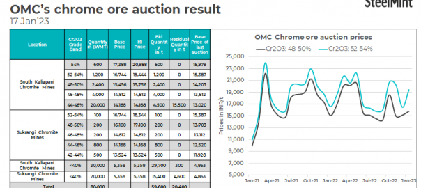 OMC’s chrome ore auction from its South Kaliapani and Sukrangi chromite mines in Odisha received a favourable response today. Out of 80,000 t put up for auction, 59,600 t were booked and high-grade material (52-54%) fetched a premium of 16% over the base price. Limited quantity of high grade ore was put up for auction, of which two grades were subjected to aggressive bidding, sources informed.