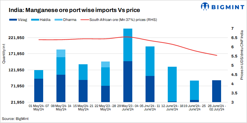 Manganese ore cargo arrival nearly stable w-o-w: Manganese ore cargo arrivals to India remained stable w-o-w, with weekly shipments reaching 90,040 t between 26 June-2 July, nearly stable from 88,785 t in the previous week. Limited high-grade ore from Gabon, due to a global container shortage, restricted India’s weekly manganese ore imports to similar levels like last week.