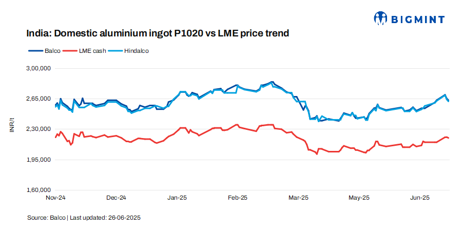 India’s primary producers reduced aluminium ingot (P1020, 99.7%) prices by up to INR 2,250/t ($26/t) compared to 25 Jun’25. Post-revision, Hindalco’s prices were at 261,750/t ($3,054/t), down by INR 2,250/t ($26/t), and Balco’s at INR 263,000/t ($3,068/t), down by INR 2,000/t ($23/t). All prices are ex-works and exclude GST. At the time of reporting, aluminium futures on the LME stood at $2,563/t.