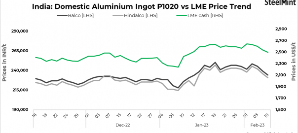 - Balco’s ADC12 and sow ingots (CG 99.5%) prices decreased INR 5,000/t to INR 237,950/t and INR 233,750/t, respectively. Hindalco’s sow ingots (CG 99.5%) prices are at INR 230,250/t.