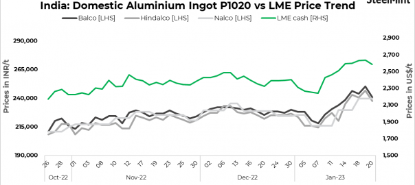 • Hindalco and Balco have decreased primary aluminium ingots (P1020, 99.7%) prices by a sharp INR 9,250/t ($114/t) today as against prices on 19 Jan’23.