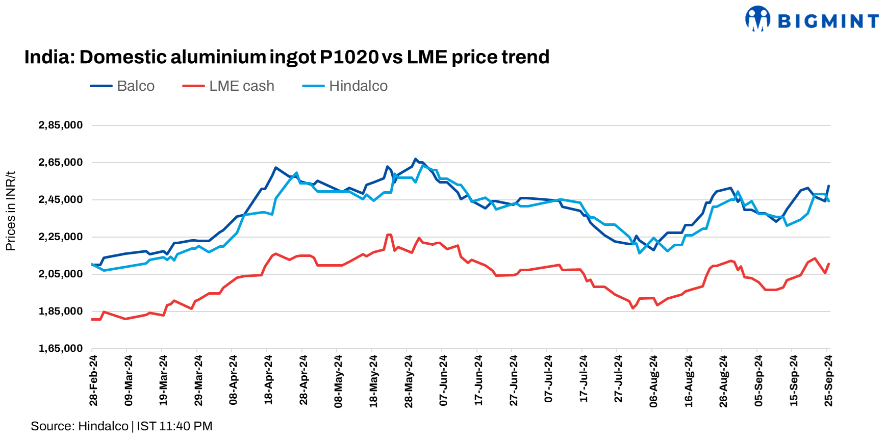 India’s primary producers raised aluminium ingot (P1020, 99.7%) prices by INR 8,250/t ($99/t) today, compared to 24 Sep’24. Post revision, Hindalco’s prices stood at INR 250,500/t ($2,959/t) and Balco’s were at INR 252,500/t ($3,022/t). All prices are ex-works and exclude GST. At the time of reporting, aluminium futures on the LME stood at $2,551/t.
