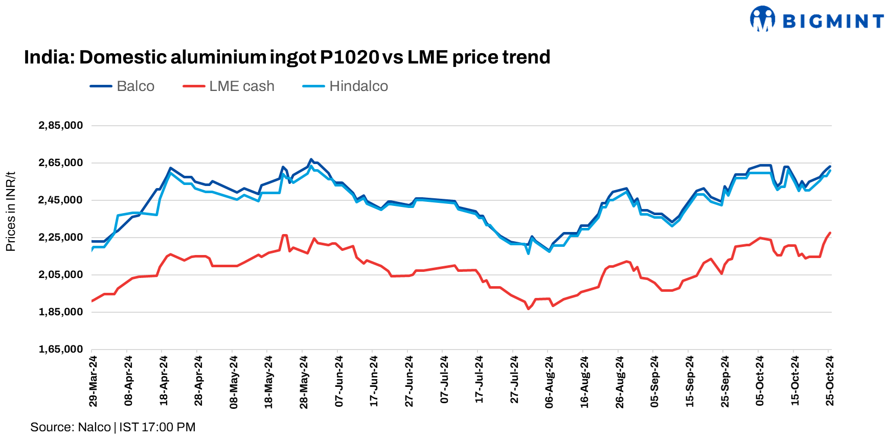 India’s primary producers raised aluminium ingot (P1020, 99.7%) prices by up to INR 3,000/t ($35/t) compared to 24 Oct. Post-revision, Hindalco’s prices were at INR 261,000/t ($3,104/t), up by INR 3,000/t ($35/t), and Balco’s were at INR 263,250/t ($3,130/t), up by INR 1,750/t ($20/t). All prices are ex-works and exclude GST. At the time of reporting, aluminium futures on the LME stood at $2,618/t.