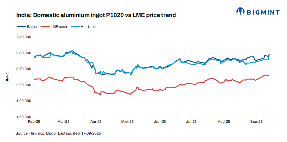 India’s primary aluminium producers raised ingot (P1020, 99.7%) prices by up to INR 3,500/t ($42/t) compared to 16 Aug’25. Post-revision, Hindalco’s prices stood at INR 274,250/t ($3,298/t), up by INR 2,250/t ($27/t), while Balco’s prices were at INR 277,250/t ($3,334/t), up by INR 3,500/t ($42/t). All prices are ex-works, excluding GST. At the time of reporting, aluminium futures on the LME stood at $2,700/t.