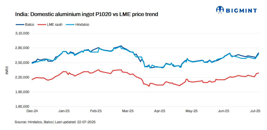 India’s primary producers increased aluminium ingot (P1020, 99.7%) prices by up to INR 6,500/t ($75/t) compared to 19 Jul’25. Post-revision, Hindalco’s prices were at 267,000/t ($3,095/t), up by INR 5,500/t ($64/t), and Balco’s at INR 269,750/t ($3,127/t), up INR 6,500/t ($75/t). All prices are ex-works and exclude GST. At the time of reporting, aluminium futures on the LME stood at $2,649/t.