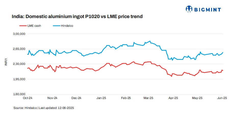 Hindalco, India’s primary aluminium producer, increased aluminium ingot (P1020, 99.7%) prices by INR 2,500/t ($29/t) today compared to 11 Jun’25. Post-revision, prices stood at INR 256,500/t ($2,999/t) for Hindalco. All prices are ex-works and exclude GST. At the time of reporting, aluminium futures on the LME were at $2,511/t.