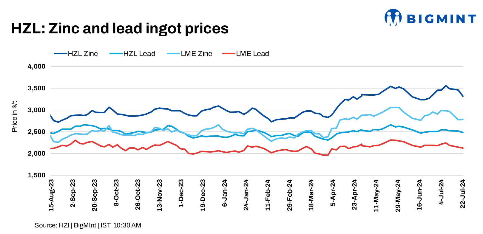 Hindustan Zinc Limited (HZL) announced revisions in its zinc and lead ingot prices. Zinc was reduced by INR 11,800/t ($141/t). Lead dropped by INR 2,700/t ($32/t) compared to 18 Jul’24. Zinc ingots are now at INR 2,77,800/t ($3,321/t), and lead ingots, at INR 2,08,100/t ($2,488/t) ex-Jodhpur. At the time of reporting, LME zinc and lead were at $2,786/t and $2,487/t, respectively.