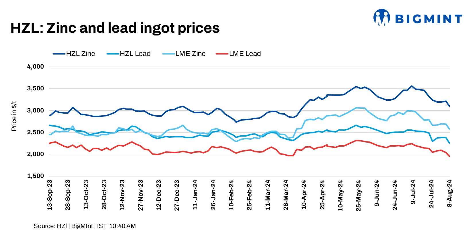 Hindustan Zinc Limited (HZL) has announced a revision in its zinc and lead ingot prices. Zinc prices fell by INR 8,300/t ($99/t). Lead prices dropped by INR 9,800/t ($117/t) compared to 5 Aug’24. Zinc ingots are now at INR 2,60,700/t ($3,105/t). Lead ingots are at INR 1,89,600/t ($2,258/t) ex-Jodhpur. LME zinc and lead were at $2,578/t and $1,953/t.