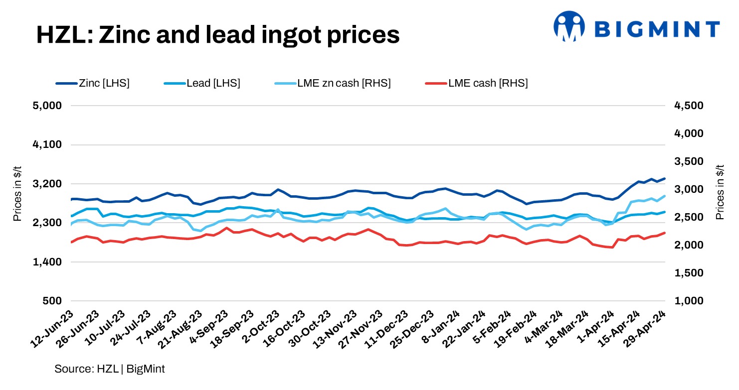 Hindustan Zinc Ltd. (HZL) has raised zinc and lead ingot prices by up to INR 6,600/t ($79/t) today. Zinc ingots are now at INR 277,500/t ($3,326/t), up by INR 6,600/t ($79/t) compared to prices on 25 Apr. Meanwhile, lead ingot prices have been increased by INR 4,400/t ($53/t) to INR 213,100/t ($2,554/t) ex-Jodhpur. LME zinc prices are at $2,883/t (up 3.1%), and lead at $2,219/t (up 2.5%).