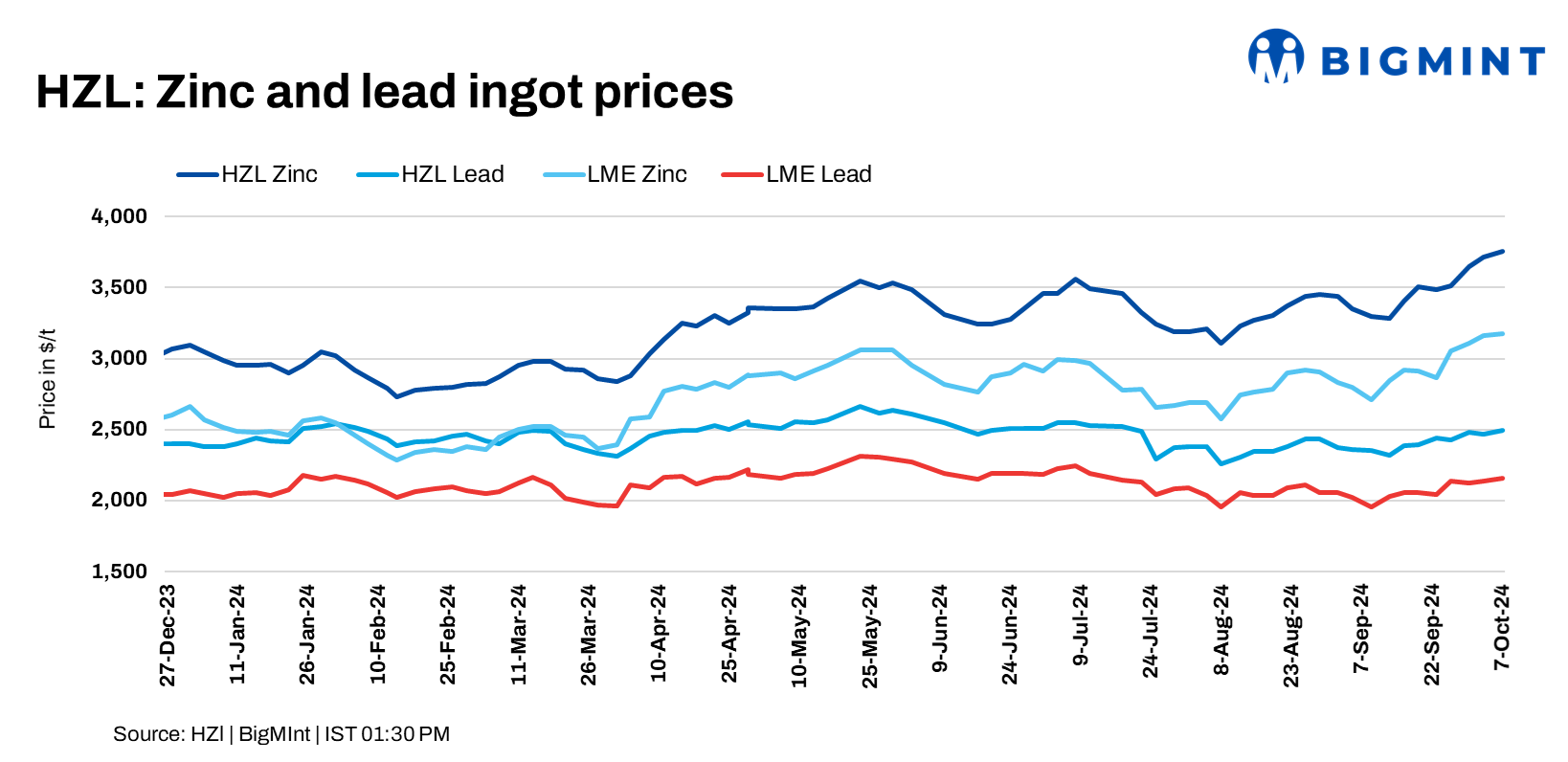 Hindustan Zinc (HZL) revised its zinc and lead ingot prices, effective 7 Oct’24. Zinc prices were raised by INR 3,600/t ($43/t) and lead by INR 2,200/t ($26/t) compared to 3 Oct’24. Post-revision, prices of zinc ingots stood at INR 315,500/t ($3,757/t) and lead ingots at INR 209,500/t ($2,494/t) ex-Jodhpur. At the time of reporting, LME zinc and lead were at $3,173/t and $2,157/t, respectively.