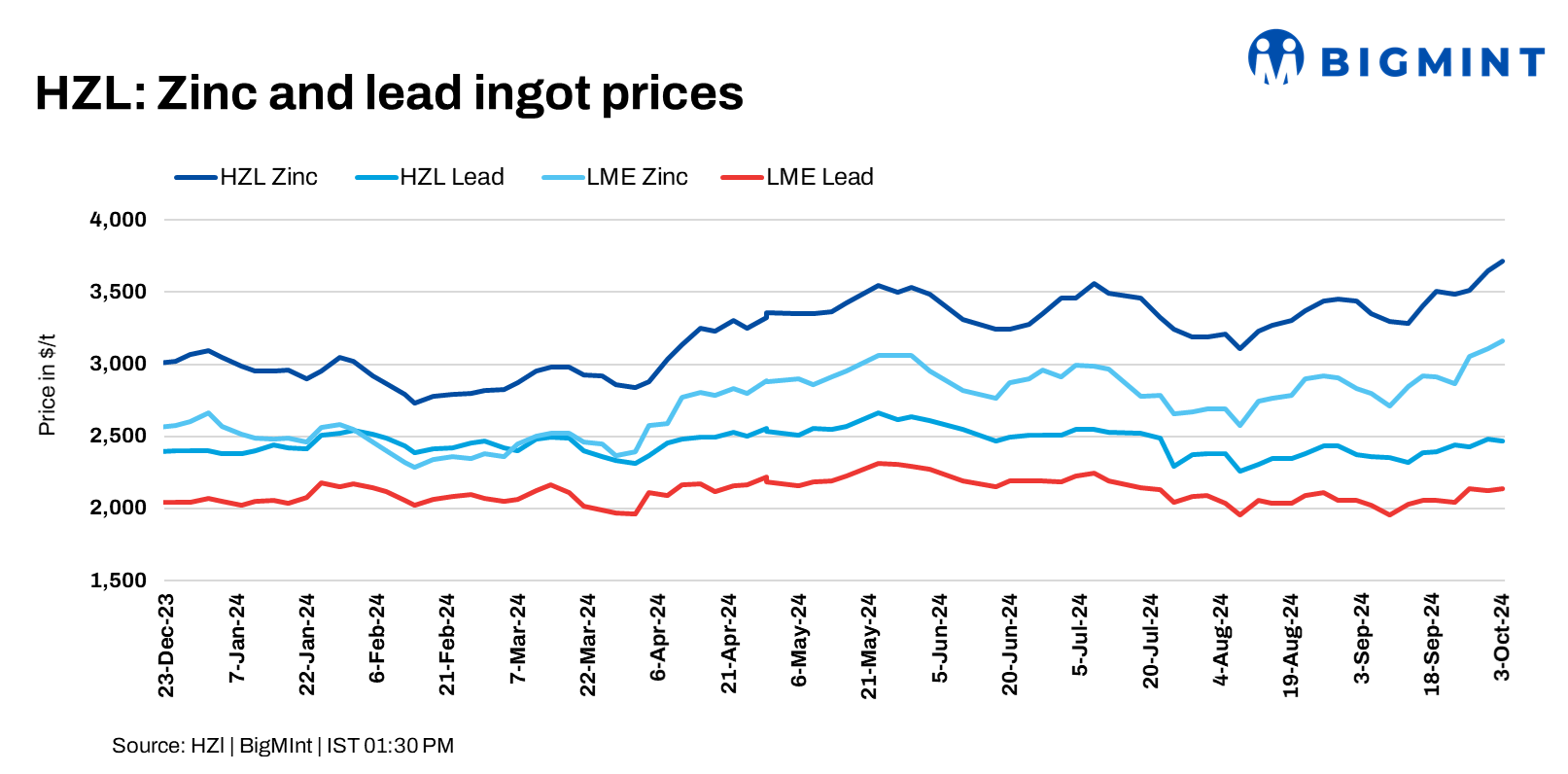 Hindustan Zinc Limited (HZL) has announced a revision in its zinc and lead ingot prices with effect from 3 Oct’24. Zinc prices rose by INR 6,400/t ($76/t). Lead prices dropped by INR 700 ($8/t) compared to 30 Sept’24. Zinc ingots are now at INR 311,900/t ($3,715/t). Lead ingots are at INR 207,300/t ($2,469/t) ex-Jodhpur. LME zinc and lead were at $3,165/t and $2,136/t.
