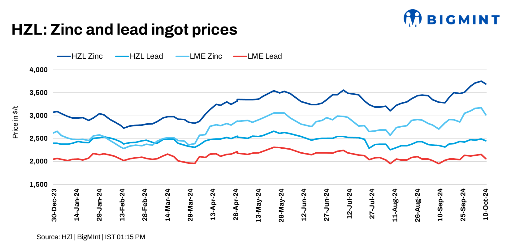 Hindustan Zinc (HZL) has revised its zinc and lead ingot prices, effective 10 Oct’24. Zinc prices were reduced by INR 5,300/t ($63/t) and lead by INR 3,300/t ($39/t) compared to 7 Oct’24. Post-revision, prices of zinc ingots stood at INR 310,200/t ($3,694/t) and lead ingots at INR 206,200/t ($2,456/t) ex-Jodhpur. At the time of reporting, LME zinc and lead were at $3,019/t and $2,065/t, respectively.