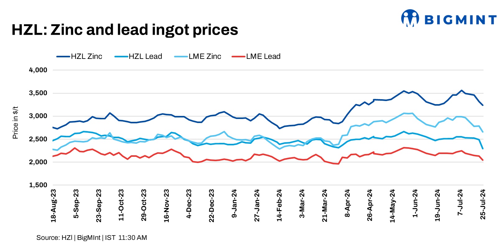 Hindustan Zinc Limited (HZL) announced revisions in its zinc and lead ingot prices. Zinc was reduced by INR 6,600/t ($79/t). Lead dropped by INR 7,700/t ($92/t) compared to 22 Jul’24. Zinc ingots are now at INR 2,71,200/t ($3,239/t), and lead ingots, at INR 2,00,400/t ($2,394/t) ex-Jodhpur. At the time of reporting, LME zinc and lead were at $2,659/t and $2,044/t, respectively.