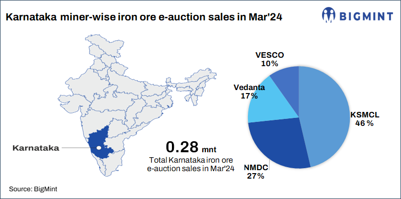 Hothur Ispat Pvt. Ltd. (HIPL) has scheduled an auction for 28,000 t of iron ore from its Jonikunta Iron Ore Mines on 19 Apr’24. Of the total quantity, 8,000 t are fines (Fe 49.50%) and 20,000 t are lumps (5-20 mm, Fe 44.50-49.50%). The floor price for fines and lumps have been set at INR 1,550/t and INR 3,000-3,800/t, respectively. Prices include royalty, DMF and NMET.