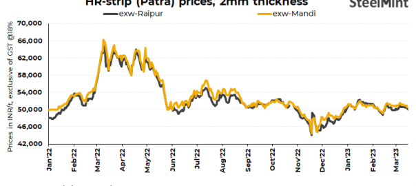 HR strip (patra) prices dropped by INR 300/t d-o-d ($4/t) in Raipur while prices decreased marginally by INR 100/t ($1/t) in Mandi Gobindgarh today. Current base grade patra (148-200mm, 2mm thick) prices stand at INR 50,000/t ($604/t) exw-Raipur and INR 50,500/t ($610/t) exw-Mandi. Prices exclude 18% GST.