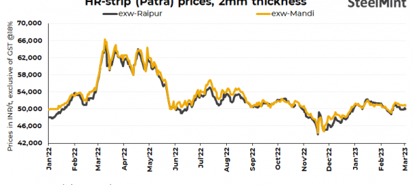 HR strip (patra) prices dropped by INR 300/t ($4/t) d-o-d in Mandi Gobindgarh. However, prices remained stable d-o-d in Raipur today. Current base grade patra (148-200mm, 2mm thick) prices stand at INR 50,700/t ($619/t) exw-Mandi and INR 50,000/t ($610/t) exw-Raipur. Prices are excluding GST at 18%.