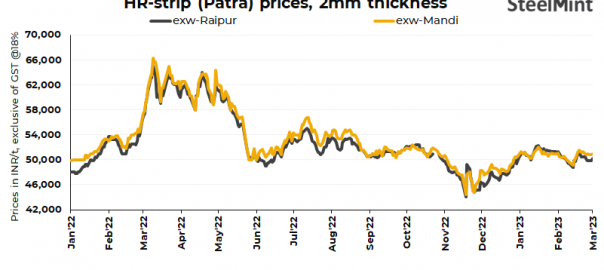 HR strip (patra) dropped by INR 200/t ($2/t) d-o-d in Raipur. However, prices remained stable d-o-d in Mandi Gobindgarh today. Current base grade patra (148-200mm, 2mm thick) prices stand at INR 50,000/t ($605/t) exw-Raipur and INR 51,000/t ($617/t) exw-Mandi. Prices are excluding GST at 18%.