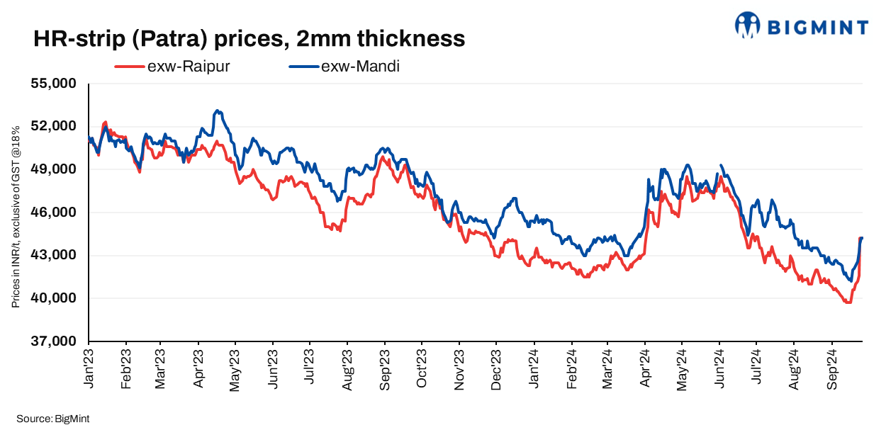 HR strip (patra) prices increased by INR 2,100/t w-o-w in Mandi Gobindgarh and by INR 1,600/t in Raipur on 27 Sep’24. Current base-grade patra (148-200 mm, 2 mm thick) prices stood at INR 44,200/t exw-Mandi and INR 42,200/t exw-Raipur. Prices exclude 18% GST. Prices rose amid sharp increase in raw material prices and improved demand for finished steel in both the markets.