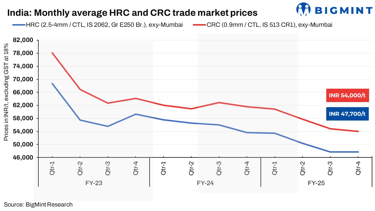 Domestic trade prices increase m-o-m: In India’s trade segment, the monthly average price of HRCs rose by INR 1,800/t ($21/t) m-o-m to INR 50,200/t ($587/t) in March 2025, while the same for CRCs increased by INR 2,300/t ($27/t) to INR 56,800/t ($664/t).