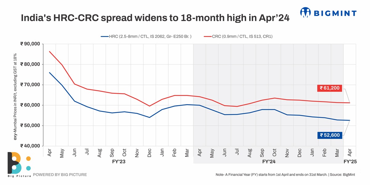 Morning Brief: The spread between benchmarked hot rolled and cold rolled coils widened to an 18-month high of INR 8,600/tonne ($103/t) in April 2024, reveals data maintained with BigMint. Such levels were last seen in October 2022.