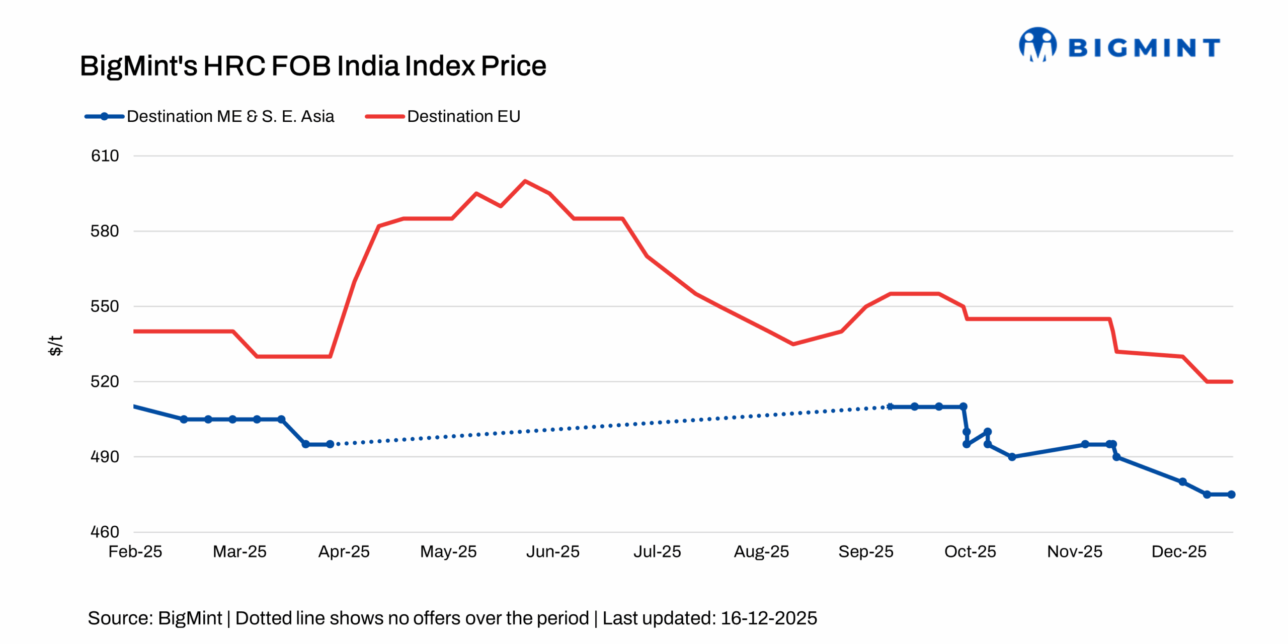 Indian HRC export offers are expected to remain largely stable in December. In Europe, CBAM, weak demand, and high inventories are likely to limit fresh offers, keeping market activity subdued. In the Middle East, weak demand ahead of the Christmas holidays may further constrain export momentum. Overall, exports are expected to remain subdued.