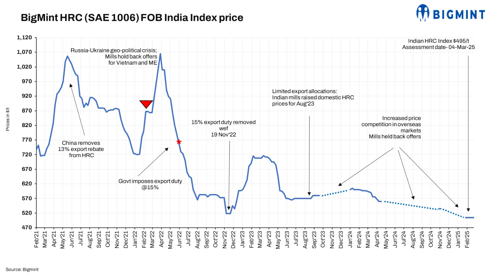 BigMint’s India hot-rolled coil (HRC) (SAE 1006) export index (for the Middle East and Vietnam) dropped by $10/t w-o-w to $495/t FOB east coast India against $505/t last week. Some recent export deals from India to the Middle East (ME) were seen as demand in this geography has improved slightly. European demand continues to face challenges due to weak market sentiment and ongoing anti-dumping investigations.