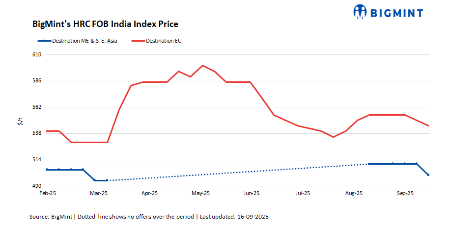 BigMint’s India hot-rolled coil (HRC, S275 for Europe) export index dropped by $5/t w-o-w to $545/tonnes (t) (FOB main port) amid cautious market sentiments. A deal was heard concluded for October shipments at $540/t FOB. While domestic demand in the region continues to face challenges, Indian mills are pushing to complete their export quotas ahead of the new CBAM implementation in January 2026.