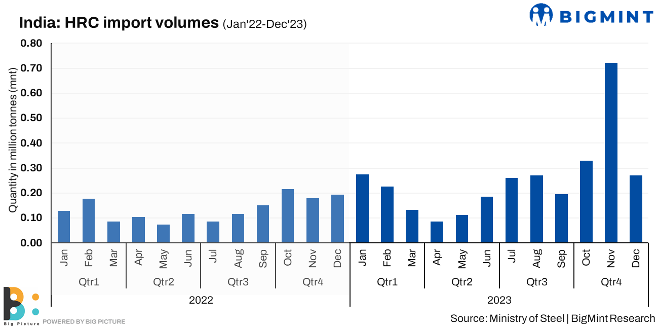 India’s HRC and plates imports surged 88% y-o-y in 2023 to over 3 mnt from 1.63 mnt in 2022. In comparison, CRC imports rose a modest 9% to 0.36 mnt (0.33 mnt in 2022) in this period. Additional supplies of HRCs tipped the balance, putting pressure on prices. NMDC’s Nagarnar Integrated Steel Plant rolled out its first hot rolled coils on a trial basis in June, last year and made around 60,000 t commercially available per month from November onwards. JSPL too recently commissioned its 5.5 mntpa hot strip mill at Angul from where some consignments were already booked. Around 160,000 t are expected per month soon enough.