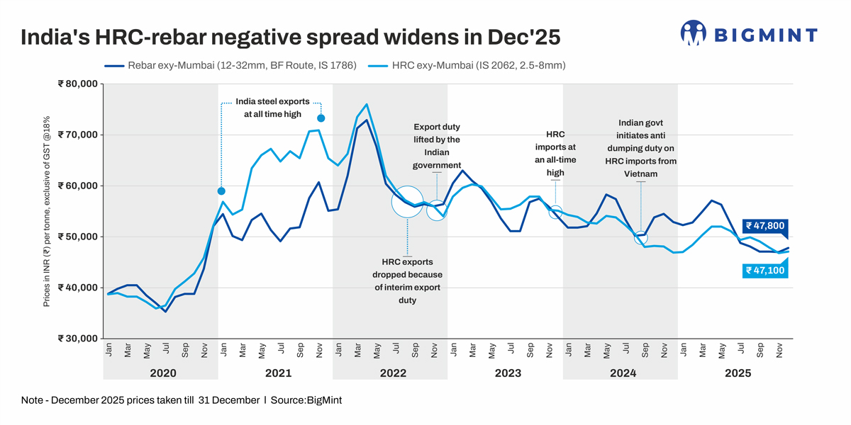 Under normal market conditions HRC commands a premium of around INR 4,000-5,000/t over BF rebar. The spread had turned positive after many months in July 2025 only to tick back into negative zone from November due to persistent weakness in global flat steel prices and weak export market sentiments.