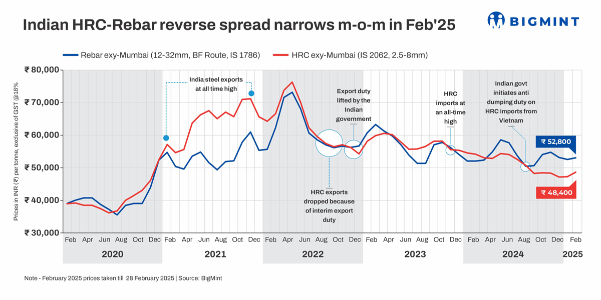 India: HRC-rebar reverse spread eases m-o-m in Feb’25. Will prices see further uptick this month?