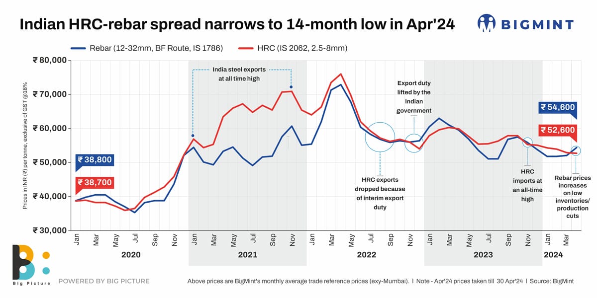 Morning Brief: In a reverse trend, benchmarked hot rolled coils (HRCs) became cheaper than rebars again after a five-month gap. Usually HRCs are sold at a premium of around INR 4,000/tonne ($48/t) to rebars. However, with this reversal, the spread between HRCs and blast furnace-route rebar narrowed in April 2024 to a 14-month low of INR 2,000/t ($24/t), reveals data maintained with BigMint. In February 2023, the spread had tightened to INR 3,400/t ($41/t).