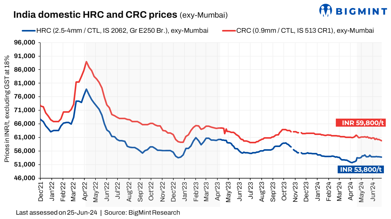 BigMint’s benchmark assessment (bi-weekly) for HRC (2.5-8mm, IS2062, Gr E-250 Br.) prices remained stable at INR 53,800/t ($645/t) on 25 June 2024 compared to the previous week. However, CRC (0.90mm, IS 513, CR1) prices went down by INR 500/t ($6/t) to INR 59,800/t ($717/t) during the same period. These prices are quoted ex-Mumbai, excluding 18% GST, and are for cut-to-length (CTL) deliveries. (INR 1 = USD 0.0119862 ; USD 1 = INR 83.4296)