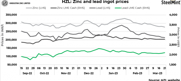 Hindustan Zinc Ltd (HZL), a subsidiary of Vedanta Ltd, has cut zinc ingots prices by a sharp INR 3,900/t ($47/t) today as against the last revision on 20 Mar’23. Effective prices of special high-grade zinc ingots stand at INR 277,100/t ($3,352/t). Whereas, lead ingots prices were stable at INR 203,900/t ($2,466/t). Prices are on exw basis, excluding GST.