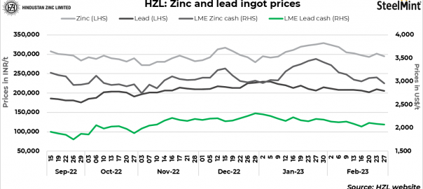Hindustan Zinc Ltd (HZL), a subsidiary of Vedanta Limited, has cut prices of zinc ingots by INR 6,700/t ($81/t) and lead ingots (99.99%) by INR 4,600/t ($55/t) today as against the last revision on 23 Feb’23. Special high grade zinc ingots prices now stand at INR 294,900/t ($3,557/t) while lead ingots prices are at INR 205,600/t ($2,480/t). Prices are exw-Jodhpur.