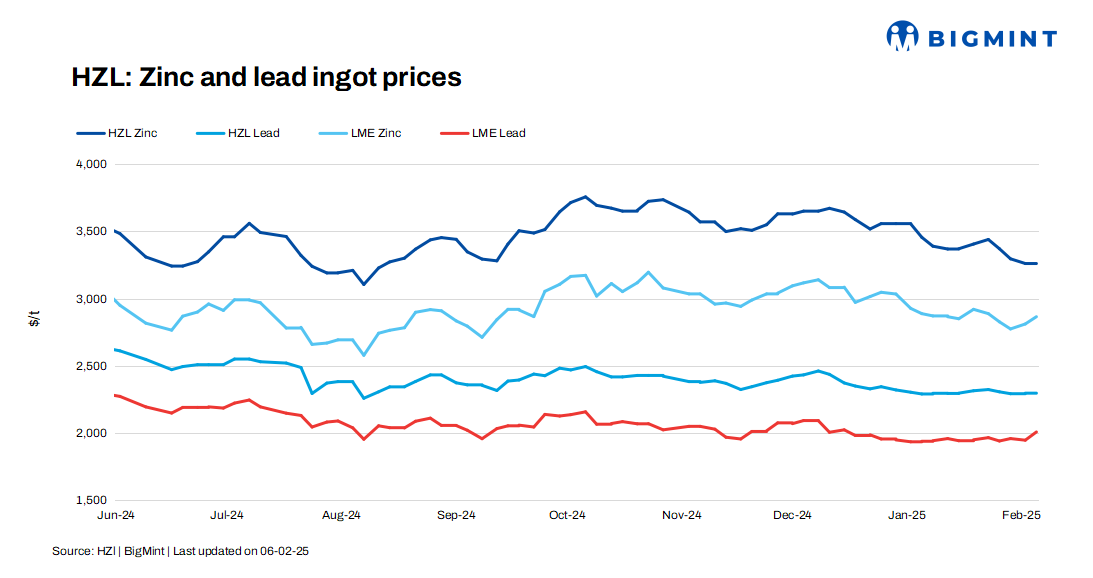 Hindustan Zinc (HZL) raised its zinc and lead ingot prices by up to INR 900/t ($10/t) and INR 700/t ($8/t), respectively, compared to 3 Feb’25. Post-revision, prices of zinc ingots are at INR 285,000/t ($3,259/t) and lead ingots at INR 200,800/t ($2,296/t) ex-Jodhpur, effective 6 Jan. At the time of reporting, LME zinc and lead were at $2,685/t and $2,009/t, respectively.