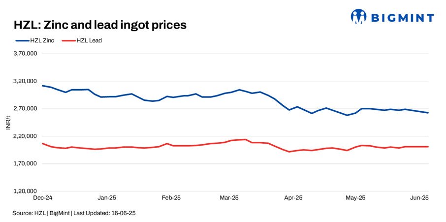Hindustan Zinc (HZL) reduced prices of zinc ingots by INR 2,300/t ($26/t), while those of lead ingots were raised by INR 500/t ($5/t), compared to 12 Jun’25. Effective 16 Jun’25, revised tags of zinc ingots were at INR 262,600/t ($3,054/t) and lead at INR 201,300/t ($2,341/t), both ex-Jodhpur. At the time of reporting, LME zinc and lead were at $2,644/t and $1,997/t, respectively.