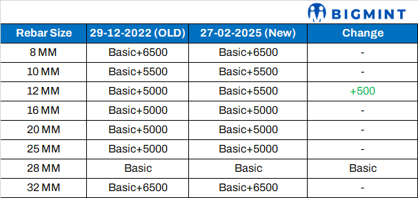 IF-route rebar manufacturers in Raigarh, Chhattisgarh, and Durgapur, West Bengal, have revised their products’ gauge parity, effective from 27 Feb’25. The gauge difference for 12 mm sizes was increased by INR 500/t to INR 5,500/t. However, parity for other sizes remains unchanged.