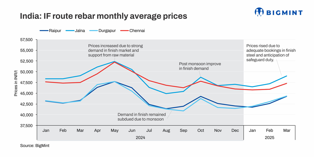 BF-route prices surge m-o-m: Trade-level blast furnace (BF) rebar prices rose by INR 2,100/t m-o-m to an average of INR 54,900/t exy-Mumbai in March 2025. Prices rose amid a number of price hikes by mills during the month. Additionally, limited material availability in the trade channel also lent support to the prices.